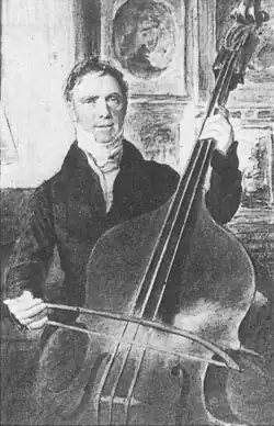 Domenico Carlo Maria Dragonetti (7 April 1763 – 16 April 1846) was an Italian double bass virtuoso and composer with a three string double bass. He stayed for thirty years in his hometown of Venice, Italy and worked at the Opera Buffa, at the Chapel of San Marco and at the Grand Opera in Vicenza. By that time he had become notable throughout Europe and had turned down several opportunities, including offers from the Tsar of Russia. In 1794, he finally moved to London to play in the orchestra of the King's Theatre, and settled there for the remainder of his life. In fifty years, he became a prominent figure in the musical events of the English capital, performing at the concerts of the Philharmonic Society of London as well as in more private events, where he would meet the most influential persons in the country, like the Prince Consort and the Duke of Leinster. He was acquainted with composers Joseph Haydn and Ludwig van Beethoven, whom he visited on several occasions in Vienna, and to whom he showed the possibilities of the double bass as a solo instrument. His ability on the instrument also demonstrated the relevance of writing scores for the double bass in the orchestra separate from that of the cello, which was the common rule at the time. He is also remembered today for the Dragonetti bow, which he developed throughout his life.