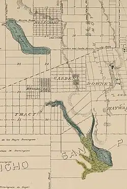 Dominguez Slough (American English pronunciation: slew or slu)[1] was an endorheic lake and wetland in present-day Gardena, Los Angeles County, California, United States. Known for much of the late 19th century and early 20th century as Nigger Slough, it was renamed Lagunas de los Dominguez in 1938 in reference to the rancho-era Dominguez family.[2] The slough was a "winding body of fresh water that wandered though Gardena and Carson on its way to the mud flats of San Pedro."[2] Gardena is reportedly so named because "of the Laguna Dominguez slough and channel which in summer cuts a green swath across the barren brown landscape—an oasis in the drab, parched landscape between Los Angeles and the harbor area."[3]