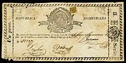 Paper money made up the bulk of circulating currency for the first peso. Provisional issues of 40 and 80 pesos were produced in 1848, followed by regular government notes for 1, 2 and 5 pesos in 1849, and 10 and 50 peso notes in 1858. The Comisión de Hacienda issued 50 and 200 pesos in 1865, whilst the Junta de Crédito introduced notes for 10 and 20 centavos that year, followed by 5 and 40 centavos in 1866 and 1, 2, 5 and 10 pesos in 1867. In 1862, the Spanish issued notes for 1⁄2, 2, 5, 15 and 25 pesos in the name of the Intendencia de Santo Domingo. The last government notes were 1 peso notes issued in 1870.