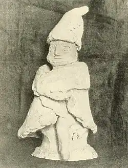The Domovoy is usually represented as an old, grey-haired man with flashing eyes. He may manifest in the form of animals, such as cats, dogs or bears, but also as the master of the house or a departed ancestor of the given family,[11] sometimes provided with a tail and little horns.[12] In some traditions the Domovoy are symbolised as snakes.[13] Household gods were represented by the Slavs as statuettes, made of clay or stone, which were placed in niches near the house's door, and later on the mantelpieces above the ovens. They were attired in the distinct costume of the tribe to which the kin belonged.[7]