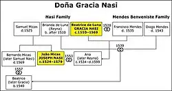 Gracia Mendes Nasi (1510 – 1569) born Beatriz de Luna Miques, also known as Doña Gracia or La Señora "The Lady", was a Portuguese Sephardi Jewish philanthropist, businesswoman, and prominent member of the Mendes Benveniste family. She became one of the wealthiest and most influential women of Renaissance Europe. As a widow, she took over the banking and trading enterprise Casa Mendes-Benveniste, which operated throughout Europe and the Mediterranean. Her nephew and business partner Joseph Nasi also became an influential figure in the Ottoman Empire.[1]