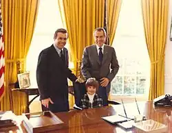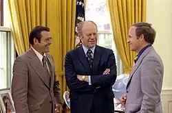 In August 1974, after Nixon resigned as president in the aftermath of the Watergate scandal, Rumsfeld was called back to Washington to serve as the transition chairman for the new president, Gerald Ford. He had been Ford's confidante since their days in the House, before Ford was House minority leader and was one of the members of the "Young Turks" who played a major role in bringing Ford to Republican leadership in the House of Representatives.[16] As the new president became settled in, Ford appointed Rumsfeld White House Chief of Staff, following Ford's appointment of General Alexander Haig to be the new Supreme Allied Commander Europe. Rumsfeld served from 1974 to 1975.[52][16]