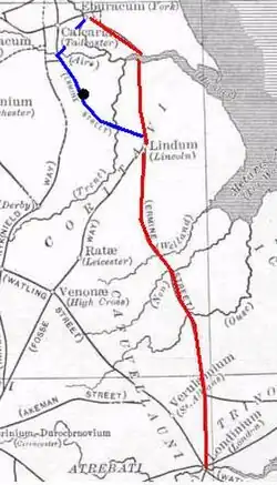 Possibly inhabited earlier, Doncaster grew up on the site of a Roman fort of the 1st century CE, at a crossing of the River Don. The 2nd-century Antonine Itinerary and early-5th-century Notitia Dignitatum (Register of Dignitaries) called the fort Danum. The first section of road to the Doncaster fort had probably been built since the early 50s, while a route through the north Derbyshire hills was opened in the later 1st century, possibly by Governor Gn. Julius Agricola in the late 70s. Doncaster provided an alternative land route between Lincoln and York, while the main route Ermine Street involved parties breaking up to cross the Humber in boats. As this was not always practical, the Romans saw Doncaster as an important staging post. The Roman road appears on two routes recorded in the Antonine Itinerary. The itinerary includes the same section of road between Lincoln and York and lists three stations between these two coloniae. Routes 7 and 8 (Iter VII & VIII) are entitled "the route from York to London".