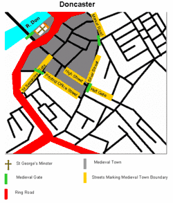 The medieval township is known to have been protected by earthen ramparts and ditches, with four substantial gates as entrances to the town. These were located at Hall Gate, St Mary's Bridge (old), St Sepulchre Gate and Sunny Bar. Today the gates at Sunny Bar are commemorated by huge "Boar Gates"; similarly, the entrance to St Sepulchre Gate is commemorated by white marble "Roman Gates". The boundary of the town mainly extended from the Don along a route known now Market Road, Silver Street, Cleveland Street and Printing Office Street.