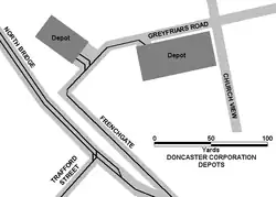 When an extension from the Racecourse to Rossington was planned in 1919, ten new trams were ordered, and since the existing depot would not be large enough, an annexe was planned. Although the Rossington link did not go ahead, the order for the trams could not be cancelled, and so they and the annexe arrived in 1920. This was also known as the Car Repairing Shed,[18] and was located on the north side of Greyfriars Road, next to Frenchgate at SE 57174 03591.[17] The main depot had seven running roads with a paintshop at the eastern end, while the smaller annexe had three running roads.