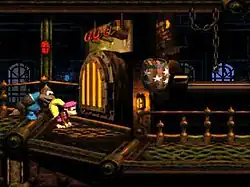 Dixie Kong's Double Trouble! is a platform game where players control Dixie Kong and her baby cousin, Kiddy Kong, through 8 worlds which comprise a total of 48 levels.[3][4] Many of the gameplay elements from previous games in the series mark a return in this game, such as barrels,[5] bonus levels which reward the player with special "bonus coins", DK coins, animal helpers and a multiplayer mode.[6] Both of the two playable Kongs have unique abilities, such as Dixie's ability to slow her descent by spinning her ponytail,[7] and Kiddy's ability to bounce across open water.[8][9] The Kongs may also pick each other up to throw each other around levels; the impact of the other player-character can reveal cracked floors, hidden switches or secret areas. At any time, the player can switch Kongs during a level.[10]
