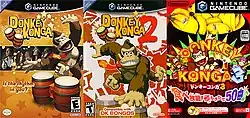 ![]() North American cover art for Donkey Konga (left) and Donkey Konga 2 (center), and Japanese cover art for Donkey Konga 3 (right) | |
