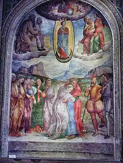 He worked chiefly at Assisi. For the church of San Crispolto of Bettona, he painted an Adoration of the Shepherds (1543), now at the Pinacoteca Civica of the town. For the Ciccoli family chapel at the church of San Francesco in Bevagna, he painted a Madonna and Child (ca. 1565), now in the city picture gallery. In Foligno, he painted a fresco depicting the Nativity with St Lucy (1544) for the monastery of Sant'Anna; a frieze for the Sala Papale (attributed, ca. 1545) of Palazzo Trinci; and a fresco depicting the Martyrdom of St Catherine of Alexandria for the nunnery of Santa Caterina Vecchia, now detached and in the Pinacoteca Civica. In Gubbio, he painted a Pietà (after 1560) and a Road to Calvary (ca. 1564) now in the Duomo.[3] He also worked with Lattanzio Pagani and Cristofano Gherardi at the no longer-extant Rocca Paolina of Perugia.