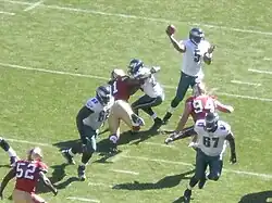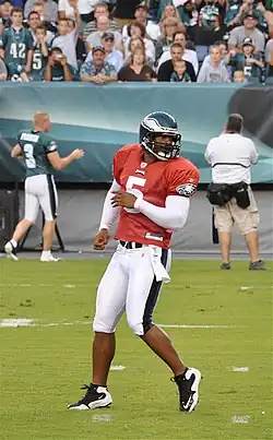 Donovan Jamal McNabb (born November 25, 1976) is an American former professional football quarterback who played in the National Football League (NFL) for 13 seasons, primarily with the Philadelphia Eagles. He played college football for the Syracuse Orange and was selected with the second overall pick in the 1999 NFL draft by the Eagles, where he spent 11 seasons. McNabb also spent a year each with the Washington Redskins and Minnesota Vikings.[1] The Eagles retired McNabb's no. 5 jersey when he was inducted to the Philadelphia Eagles Hall of Fame in 2013.[2]