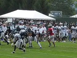 McNabb was drafted in the first round as the second overall pick by the Eagles, behind first pick Tim Couch, in the 1999 NFL draft.[36] A group of Eagles fans known as the "Dirty 30" were sent to the draft by sports radio host Angelo Cataldi and Philadelphia Mayor Ed Rendell. The two believed the Eagles would select running back Ricky Williams and they wanted the fans to cheer the selection. However, when the Eagles selected McNabb the "Dirty 30" ended up loudly booing McNabb when he appeared on stage.[37] McNabb was the second of five quarterbacks selected in the first 12 picks of a quarterback-rich class that was at that point considered the best quarterback draft since the famous class of 1983. However, only McNabb and Daunte Culpepper went on to have successful careers in the NFL; Tim Couch struggled with the Cleveland Browns and officially retired in 2007 after being cut by the Jacksonville Jaguars in a failed comeback bid, while Akili Smith and Cade McNown were out of the NFL by 2002. By 2006, only McNabb was still with the team that originally drafted him.[38]