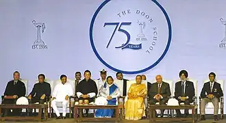 Founder's Day is a three-four day event in the autumn term, usually October, that marks the school's founding and draws many ex-pupils from all parts of the world.[51] The chief guest is usually a prominent person, and the events include exhibitions, productions of plays, yoga sessions, live bands, a fete and an orchestral concert given by members of the school's Music Society.[52][53] Doon celebrated its 75th Founder's Day in 2010 and programmed events on an unprecedented scale.[54][55] The event was christened DS-75.[56][57] Among the chief guests were the then President of India Pratibha Patil, King Jigme Khesar Namgyel Wangchuck of Bhutan, and Kapil Sibal, then minister of Human Resource Development.[58] Pratibha Patil, in her address, urged the school authorities to make Doon a co-educational institution.[59] One of the main events was a discussion, dubbed the "Chandbagh Debate", held between alumni including Vikram Seth, Kamal Nath, Manpreet Singh Badal, Jyotiraditya Madhavrao Scindia and retired headmaster Kanti Bajpai, on the topic Can India lead?. It was moderated by television commentator Karan Thapar, an alumnus of the school.[60]
