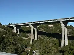 Four arched concrete piers support the twin girder bridges.[1] They use modified Gothic arches;[16] the finish was left in the natural concrete color, and the surfaces were contoured to help them blend into their surroundings.[17] The twin bridges contain five parallel welded steel girders and are connected by a 22-foot (6.7 m) wide concrete slab.[2] The structural steel is concealed by a slanted panel on either side.[1] Bids were opened on April 7, 1965, for the stretch of freeway including the San Mateo Creek Bridge.[3] To minimize impact on the gorge below, materials were lowered from a "high line" built between towers on the adjoining cliffs. It is next to the 1888 Crystal Springs Dam, which was (at the time of its completion) the largest concrete structure in the world.[17] Construction of the first pier began in January 1966.[18]