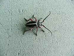The length of the adults is 11–16 millimetres (0.43–0.63 in). They are black colored. The first segments of the antennae and legs are red. The elytron has a white seam and is dull colored, and has a slightly marginal strip at the top of the shoulder.