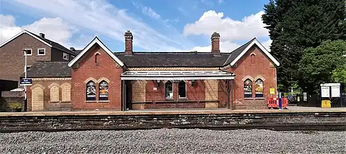 The station is unstaffed but has a self-service ticket machine available. The old station buildings are now in private commercial use as a restaurant.[16] A small brick waiting shelter is provided at the northern end of the platform, along with passenger information displays, automatic announcements and timetable poster boards to offer train running information. Step-free access is available from the adjacent car park to one of the platforms.[17]