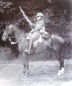 The first contingent of recruits contained 550 officers, 10,371 men with 20 battalions and 4 companies,[6] which arrived in South Africa between February and April, 1900.[7] On arrival, the regiment was sent throughout the zone of operations. The Queen's Own Dorset Yeomanry provided troops for the 26th Company, 7th Battalion, fighting at the Relief of Wepener, Battle of Doornkop, Battle of Diamond Hill, Capture of Pretoria, Battle of Boschfontein, Battle of Nooitgedacht, and the Battle of Middelfontein along with many other patrols and skirmishes.[8]
