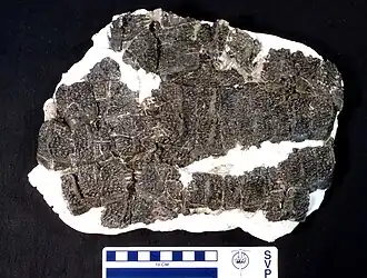 In the 1950s and 1960s, several additional bones (including vertebrae, osteoderms, a dentary, and a femur) were unearthed near Ashland, a little south of Doswell. These specimens were initially believed to have belonged to phytosaurs, but were recognized as pertaining to Doswellia after the Doswell specimens were found. The Ashland specimens are cataloged as USNM 186989 and USNM 244215.[5] Assorted osteoderms and vertebrae from the Otis Chalk and Colorado City Formation in Texas, as well as the Monitor Butte Formation in Utah have also been assigned to Doswellia.[6][1] Fossils referable to Doswellia cf. kaltenbachi are known from Petrified Forest National Park in Arizona. They were found in the Blue Mesa Member of the Chinle Formation, making the Arizona remains among the youngest in the genus.[3]