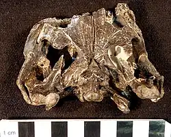 Doswellia is an extinct genus of archosauriform from the Late Triassic of North America. It is the most notable member of the family Doswelliidae, related to the proterochampsids. Doswellia was a low and heavily built carnivore which lived during the Carnian stage of the Late Triassic.[1] It possesses many unusual features including a wide, flattened head with narrow jaws and a box-like rib cage surrounded by many rows of bony plates. The type species Doswellia kaltenbachi was named in 1980 from fossils found within the Vinita member of the Doswell Formation (formerly known as the Falling Creek Formation) in Virginia. The formation, which is found in the Taylorsville Basin, is part of the larger Newark Supergroup. Doswellia is named after Doswell, the town from which much of the taxon's remains have been found. A second species, D. sixmilensis, was described in 2012 from the Bluewater Creek Formation of the Chinle Group in New Mexico;[1] however, this species was subsequently transferred to a separate doswelliid genus, Rugarhynchos.[2] Bonafide Doswellia kaltenbachi fossils are also known from the Chinle Formation of Arizona.[3]