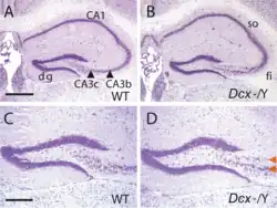 In mice where the Doublecortin gene has been knocked out, cortical layers are still correctly formed. However, the hippocampi of these mice show disorganisation in the CA3 region. The normally single layer of pyramidal cells in mutants is seen as a double layer. These mice also have different behavior than their wild type littermates and are epileptic.[10]