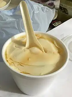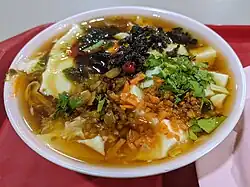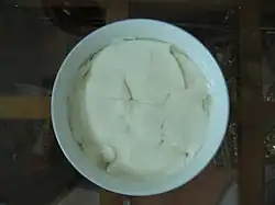 Douhua (Chinese: 豆花; pinyin: dòuhuā; Pe̍h-ōe-jī: tāu-hoe) is a Chinese sweet or savoury snack made with silken tofu. It is also referred to as doufuhua (Chinese: 豆腐花; pinyin: dòufuhuā), doufunao (Chinese: 豆腐脑; pinyin: dòufunǎo; "tofu brains") in northern China,[1] tofu pudding,[2] and soybean pudding.[3]