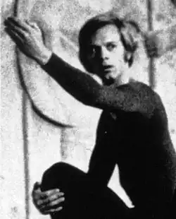 Dunn uses many different choreographic elements in his dances which makes it hard to classify him into a specific genre of dance.[2] He conveyed a minimalist approach in his work by using elements of silence, stillness, simple movements, text, pedestrian movements, gestures, wit, and humor. He also incorporated varying aesthetics such as elaborate costume, music, set designs, and lights. In 101, a performance exhibit choreographed in 1974, Dunn used his apartment to create a maze of cubes of rough-hewn lumber that covered his entire loft. For four hours a day and six days a week in two months he held an open studio for viewers to enter the set and explore his creation in which they would find him lying on top of the boxes in a sort of trance with his eyes closed.[2] Among Dunn's best-known works are, Nevada, Four for Nothing, 101, Octopus, Time Out, Gestures in Red, and Lazy Madge.[3] He is mostly known for creating solo pieces like Lazy Madge, Haole, and Nevada. However, he also created many group pieces like Celeste in 1977 which featured about forty dancers.[4] and many later large group works such as Stucco Moon, Spell For Opening The Mouth Of N, Informations, Cleave, Buridan's Ass, and Cassations. In 1980, Dunn created Pulcinella as a commission for the Paris Opera Ballet. He was commissioned by l'Opéra de Paris in 1981 to set his work, Cycles, on the Groupe de Recherche Chorégraphique.[4]