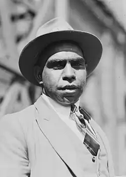 William Cooper, an uncle to Nicholls, mentored him in leadership, eventually placing him as the secretary of the Australian Aborigines' League.[20] It was a founding principle of the League that Aboriginal Affairs was made a Federal matter, which would require a change in the Constitution of Australia, which could only be effected by a referendum. As early as February 1935 Cooper, Nicholls and others were lobbying Members of Parliament, such as Thomas Paterson, the Commonwealth minister for the interior on this issue. It gained national attention when Nicholls, leveraging his profile as a nationally famous athlete, participated in the Day of Mourning protest for Aborigines held in Sydney on 26 January 1938, where Indigenous leaders from across the country made the demand to change the Constitution. The proposed resolution was: