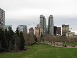 Downtown Bellevue is the central business district of Bellevue, Washington, United States. It is bounded by I-405 to the east, NE 12th Street to the north, 100th Ave NE to the west, and Main Street to the south, and covers an area of around 400 acres (160 ha).[1] It is the second largest city center in Washington state, with more than 50,000 employees and 12,000 residents.[2] Geographically centered near the heart of the Puget Sound region, downtown Bellevue is a regional growth center offering over 9 million square feet (840,000 m2) of Class A office space, various major retail and entertainment locations, more than 2,500 hotel rooms and almost 10,000 housing units.