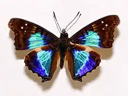 Doxocopa cyane has a wingspan of about 55 millimetres (2.2 in).[5] The color of the wings varies by sex. Males show a brilliant electric-blue iridescence on the upperside of the wings, while the wings of the females lack this iridescence. Females have usually a brown ground color with wide longitudinal bands of orange and white on forewings and hindwings.[4]