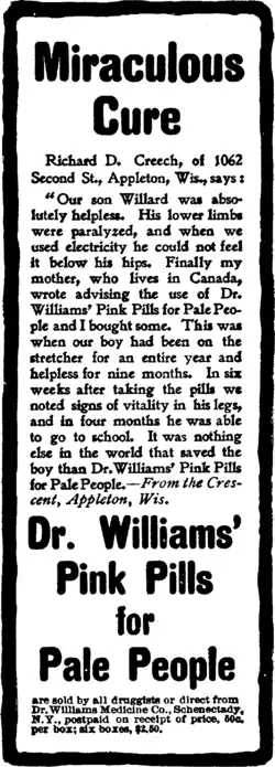 Dr. Williams' Pink Pills for Pale People was a late 19th to early 20th-century patent medicine containing mostly ferrous sulfate.[1] It was produced by Dr. Williams Medicine Company, the trading arm of G. T. Fulford & Company. It was claimed to cure chorea, referenced frequently in newspaper headlines as "St. Vitus' Dance"; as well as "locomotor ataxia, partial paralyxia, seistica, neuralgia rheumatism, nervous headache, the after-effects of la grippe, palpitation of the heart, pale and sallow complexions, [and] all forms of weakness in male or female."