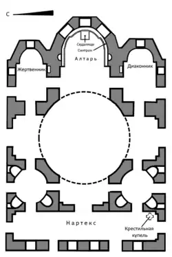 , The cathedral belongs to the cross-domed type, which was formed in Byzantine architecture in the 5th - 8th centuries. The three pentagonal apses adjacent to the east include an altar, a deacon and an altar, which in the western part of the temple correspond to two semi-circular rooms with niches. On the west, the temple ends with a vestibule. The dome of the temple is erected on a low sixteen-sided drum.