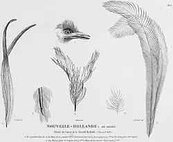Péron's 1807, three-volume account of the expedition, Voyage de découverte aux terres Australes, contains an illustration (plate 36) of "casoars" by Charles-Alexandre Lesueur, who was the resident artist during Baudin's voyage. The caption states the birds shown are from "Ile Decrès", the French name for Kangaroo Island, but there is confusion over what is actually depicted.[13] The two adult birds are labelled as a male and female of the same species, surrounded by juveniles. The family-group shown is improbable, since breeding pairs of the mainland emu split up once the male begins incubating the eggs. Lesueur's preparatory sketches also indicate these may have been drawn after the captive birds in Jardin des Plantes, and not wild ones, which would have been harder to observe for extended periods.[4]