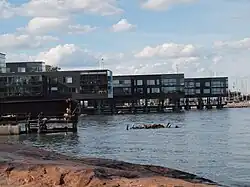 Vattuniemi is an area in the southern part of the island of Lauttasaari. Vattuniemi was built in the 1940s and 1950s as an industrial area,[10]: 193 with diverse corporate activity such as the factory of Suomen Tupakka ("Finnish Tobacco") which ceased activities in 1995.[11] Other former factories in the area include the Hellberg radio factory (Oy Radio E Hellberg Ab), the wood veneer factory of Mahogany Oy[12] and the glue factory of Eri Oy.[13] The area has also included the head offices of Helkama and Lääketukku.[12]