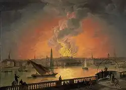 The comedy actor John Bannister became acting manager in 1802. With Sheridan's son Tom, and in the circle of Richard Wroughton (stage-manager), William Dowton, Michael Kelly, Tom Dibdin and their likes, he helped to see the Theatre Royal through its next catastrophe.[64] On 24 February 1809, despite the previously mentioned fire safety precautions, the theatre burned down.[65] On being encountered drinking a glass of wine in the street while watching the fire, R.B. Sheridan was famously reported to have said: "A man may surely be allowed to take a glass of wine by his own fireside."[66] Already on the shakiest financial ground, Sheridan was ruined entirely by the loss of the building. He turned to brewer Samuel Whitbread, an old friend, for help.[67] As well as investing strongly in the project, Whitbread agreed to head a committee that would manage the company and oversee the rebuilding of the theatre, but asked Sheridan to withdraw from management himself, which he did entirely by 1811.[68]