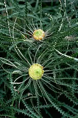 Banksia mucronulata, commonly known as swordfish dryandra,[2] is a species of shrub that is endemic to Western Australia. It has spreading, hairy stems, linear, deeply pinnatifid leaves with sharply-pointed lobes, pale yellow to cream-coloured flowers in heads of between 80 and 180, and egg-shaped follicles.