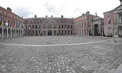 Panorama view. The upper yard of the Dublin Castle, Dublin, Ireland. The view shows, from left to right: Conference Centre, Bedford Hall flanked by the Gates of Fortitude and Justice, Revenue Commissioners, entranceway from the Chapel Royal/Record Tower yard, and finally States Apartments and Dubhlinn Tearooms. -