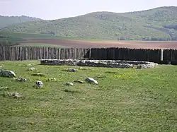 Ducové is known for an archaeological site on the Kostolec hill, where a Great Moravian fortified settlement has been unearthed. Excavations of older settlements from the Stone Age, Bronze Age and the Roman era indicate that Ducové benefited from its location on the Amber Road well before the Great Moravian era. The Slavic court was founded in the mid-9th century after the fall of the nearby hill fort in Pobedim, frequently associated with the unification of principality of Moravia and Nitra. The court was similar to Frankish courts from the 8th-9th centuries and inhabited by representatives of the Slavic elite.[8] It was protected by a massive oak palisade, doubled on one side and built on top of the prehistoric mound.[8] Administrative and representative functions were highlighted by the strategic location near the river ford.[9] Interior space was divided by additional palisades and occupied by residential buildings, outbuildings, a Christian rotunda church and a graveyard. The round rotunda with an apse is similar to rotunda found in Staré Město.[10] The court existed until 940-970[11] when it burned, most likely during the attack of the old Hungarians. The rotunda and the graveyard had been used by neighbouring villages also after the destruction of the residential buildings, the rotunda until the 11-12 century and the graveyard until the 14th.[10]