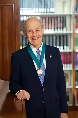 Herschbach is a Fellow of the American Academy of Arts and Sciences, the National Academy of Sciences, the American Philosophical Society and the Royal Chemical Society of Great Britain.[4] In addition to the Nobel Prize in Chemistry, he has received a wide variety of national and international awards. These include the National Medal of Science, the ACS Award in Pure Chemistry, the Linus Pauling Medal, the Irving Langmuir Award,[16] the Golden Plate Award of the American Academy of Achievement,[23] and the American Institute of Chemists Gold Medal.[24] He endowed the Herschbach Medal, which is given by the biennial Conference on Molecular Collision Dynamics, to recognize "outstanding theoretical and experimental contributions to the field."[25]