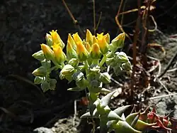 Dudleya cymosa subsp. crebrifolia is a subspecies of succulent plant commonly known as the San Gabriel River dudleya. Endemic to Los Angeles County, California, this very distinct subspecies is only known from the granitic slopes of a few canyons at the foot of the San Gabriel Mountains near Azusa. It is characterized by the tightly spaced bracts along its inflorescence and its mustard-yellow flowers that bloom from late June to July. It grows with another rare endemic, Dudleya densiflora.[2]