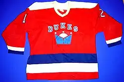 The Dukes colours were red, white & blue. The home jerseys had a white background with red & blue trim. The road jerseys were a red background with white and blue trim. Their uniforms were similar to those worn at the time by the National Hockey League's Washington Capitals. The colour of the top of the crown on the logo was either red or white, opposite or the background of the home or away jersey.
