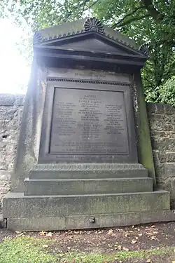 Firstly, in 1829, he married Grant Aitken[3] (1805–1833). Following her death he married Christina Gordon Renton (1813–1841). Finally, in 1848, he married Priscilla Bright (1815–1906), who outlived him by twenty years. All three wives are buried with him.