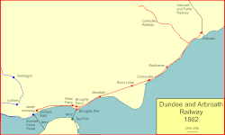 Grainger and Miller settled on the track gauge of 5 ft 6in (1,676 mm). They did not conceive of the likelihood of interoperability with other lines (although the A&FR was considered a partner of the Dundee and Arbroath and was to use the same gauge), and selected the gauge as a compromise between the (English) standard gauge and the broad gauge of Isambard Kingdom Brunel.[note 1] The line was to run close to the coast between the two termini, but a branch was authorised to Almericloss,[note 2] an area close to the A&FR station where it was expected that there would be an interchange depot. The main Arbroath terminal was to be at Lady Loan, on the sea front and a little short of the harbour. At Dundee the station was to be at Trades Lane, close to the expanded dock complex then under construction.[1][3][4]