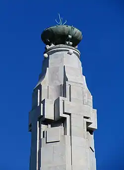 The monument is built from concrete with a facing of Carrara marble, and was conceived by Gummer as a 28-metre (92 ft) tall eight-sided column, this design reflecting Dunedin's octagonal city centre and being appropriate for an irregularly shaped site, and is topped by a symbolic beacon. From the central column, a sacrificial urn and four crosses emerge, representing sacrifice. These, along with a relief frieze on the base featuring a lion, torches, laurel wreathes, and fasces, were designed by sculptor Richard Oliver Gross.[4] The original intention was for a bronze frieze to surround the base, but a funding shortfall forced this to be abandoned.[2]