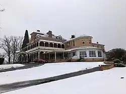On either side dormer windows (later additions) are set into the slate, hipped roof. Eaves are bracketed, which, with the towers, gives the house an Italianate feel. An elongated double front door is flanked by stained glass reveals and a fanlight.[1]
