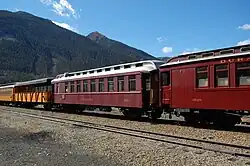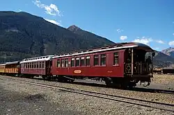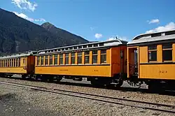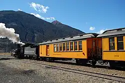 After World War II, domestic tourism began to grow across the country and the Silverton branch of the railroad would benefit. Bolstered by national exposure via Hollywood movies being filmed along the line in the late 1940s, the railroad created The Silverton, a summer-only train service, on June 24, 1947.[13] A short time later, the railroad adorned a locomotive and four coaches with a colorful yellow paint scheme and launched modest public promotion. With this effort, "The Painted Train" officially started a new era of tourism that continues to this day. Freight traffic, however, continued to decline, and during the 1950s The Silverton operated as a mixed train.[14]