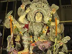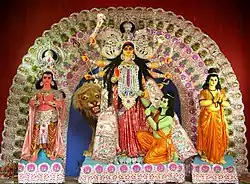 Durga Puja is a widely celebrated festival in the Indian states of West Bengal, Bihar, Jharkhand, Uttar Pradesh (eastern parts), Assam, and Odisha.[146] It is celebrated over a five-day period. Streets are decked up with festive lights, loudspeakers play festive songs as well as recitation of hymns and chants by priests, and pandals are erected by communities. The roads become overcrowded with revellers, devotees, and pandal-hoppers visiting the pandals on puja days. It often creates chaotic traffic conditions. Shops, eateries, and restaurants stay open all night; fairs are also set up and cultural programmes are held.[147] People form organizing committees, which plan and oversee the pandal during the festivities. Today, Durga Puja has turned into a consumerist social carnival, a major public spectacle and a major arts event riding on the wave of commercialisation, corporate sponsorship, and craze for award-winning. For private domestic pujas, families dedicate an area of their homes, known as thakur dalan, for Durga Puja where the sculpture-idols for worship is placed and decorated with home-dyed fabric, sola ornamentations, and gold and silver foil decorations. Elaborate rituals like arati are performed and prasad is distributed after being offered to the deities. As a tradition, married daughters visit their parents and celebrate the Durga Puja with them, a symbolism alluding to Durga who is popularly believed to return to her natal home during the puja.[148]