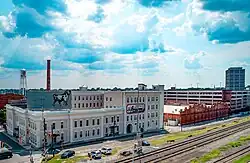 Durham's location is a result of the needs of the 19th century railroad industry. The wood-burning steam locomotives of the time had to stop frequently for wood and water and the new North Carolina Railroad needed a depot between the settled towns of Raleigh and Hillsborough. The residents of what is now downtown Durham thought their businesses catering to livestock drivers had a better future than "a new-fangled nonsense like a railroad" and refused to sell or lease land for a depot.[21] In 1849, a North Carolina Railroad depot was established on a four-acre tract of land donated by Dr. Bartlett S. Durham; the station was named after him in recognition of his gift.[22] A U.S. post office was established there on April 26, 1853, now recognized as the city's official birthday.[22]