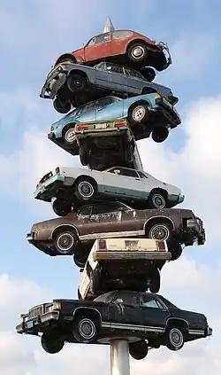 Dustin Shuler (August 17, 1948 โ May 4, 2010)[1] was an American pop art sculptor and mixed-media artist, best known for a 1989 piece called Spindle, a 50-foot steel spike with eight cars impaled on it that became emblematic of the city of Berwyn, Illinois, where it was installed for two decades in the parking lot of a popular shopping mall.[2] Most of Shuler's major works consisted of outdoor art installations, and the majority of his sculptures used elements of consumer-goods detritus.