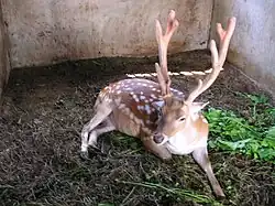 After establishing their fortress, the Dutch realised the potential of the vast herds of the native Formosan sika deer (Cervus nippon taioanus) roaming the western plains of the island. The tough deer skins were highly prized by the Japanese, who used them to make samurai armour. Other parts of the deer were sold to Chinese traders for meat and medical use. The Dutch paid aborigines for the deer brought to them and tried to manage the deer stocks to keep up with demand. Unfortunately the deer the aborigines had relied on for their livelihoods began to disappear, forcing the aborigines to adopt new means of survival.[75] However, the subspecies was kept alive in captivity and subsequent reintroduction of the subspecies into the wild has been successful.[76] In 1638, the Dutch exported 151,400 deer hides from Taiwan to Japan.[77] Although the number of deer hides exported to Japan dropped due to the decreased deer population, the considerable number of deer hides ranged from 50,000 to 80,000 was still exported.[77] Tea was also a major export item. After Chinese people settled in Taiwan, they started to grow tea on less fertile hillsides where rice could not be cultivated.[77]