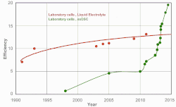 On July 11, 2013, Dyesol /EPFL announced a new record DSC efficiency. Michael Grätzel stated "Our research work on solid-state Dye Solar Cells (ss-DSC) is now achieving efficiencies exceeding 15%".[7] However, this is now considered a perovskite solar cell and the official accredited DSC solar cell efficiency is 11.9% determined by the National Renewable Energy Laboratory.[8] This efficiency is not expected to greatly increase as the DSC field has largely shifted to the development of perovskite solar cells which have achieved certified efficiencies over 23%.[9]