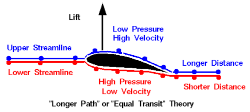 While it is true that the flow speeds up, a serious flaw in this explanation is that it does not correctly explain what causes the flow to speed up.[4] The longer-path-length explanation is incorrect. No difference in path length is needed, and even when there is a difference, it is typically much too small to explain the observed speed difference.[40] This is because the assumption of equal transit time is wrong when applied to a body generating lift. There is no physical principle that requires equal transit time in all situations and experimental results confirm that for a body generating lift the transit times are not equal.[41][42][43][44][45][46] In fact, the air moving past the top of an airfoil generating lift moves much faster than equal transit time predicts.[47] The much higher flow speed over the upper surface can be clearly seen in this animated flow visualization.