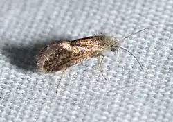 The wingspan is 10–13 mm for males and 9-12.5 mm for females. The forewings are golden bronze, heavily mottled with minute specks of darker scales. The hindwings are paler, grayish with a slight purplish luster, sparsely covered with moderately broad scales. The moth flies from late February to late May in one generation per year.[1]